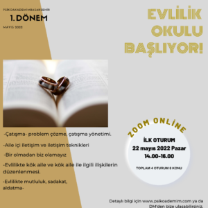 Not: Evlilik okuluna katılımcılarımıza tüm eğitimlere katılmaları sonucunda katılım belgesi verilecektir. Katılım belgesi almaya hak kazananların, program sonrasında kullanılmak üzere ücretsiz bir seans çift terapisi katılım hakları olacaktır.